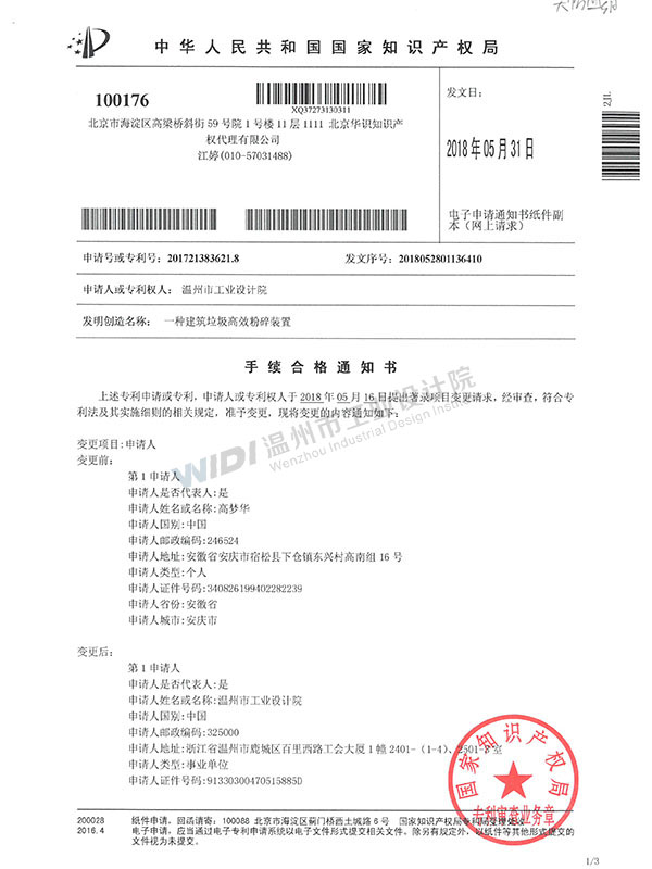 一種建筑垃圾高效粉碎裝置手續(xù)合格通知書 (1)