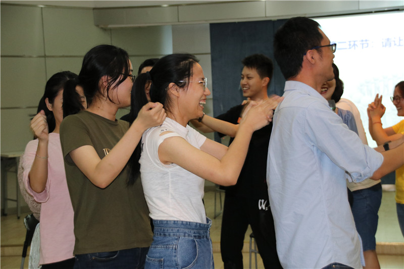 活動(dòng)在勵(lì)志歌曲“追夢(mèng)赤子心”的音樂聲中拉開序幕。大家在指導(dǎo)老師的引領(lǐng)下,分成二個(gè)小組共同進(jìn)入“大風(fēng)吹”“請(qǐng)讓我為你按摩一下下”“優(yōu)點(diǎn)轟炸”“銜紙杯傳水” “同心圓”五個(gè)活動(dòng)環(huán)節(jié)。其中,“大風(fēng)吹”環(huán)節(jié)讓大家自我介紹并相互認(rèn)識(shí),“請(qǐng)讓我為你按摩一下下”拉近了大家的距離感,同時(shí)也使大家心情得到放松,“銜紙杯傳水”環(huán)節(jié)更將活動(dòng)氣氛帶入了高潮。